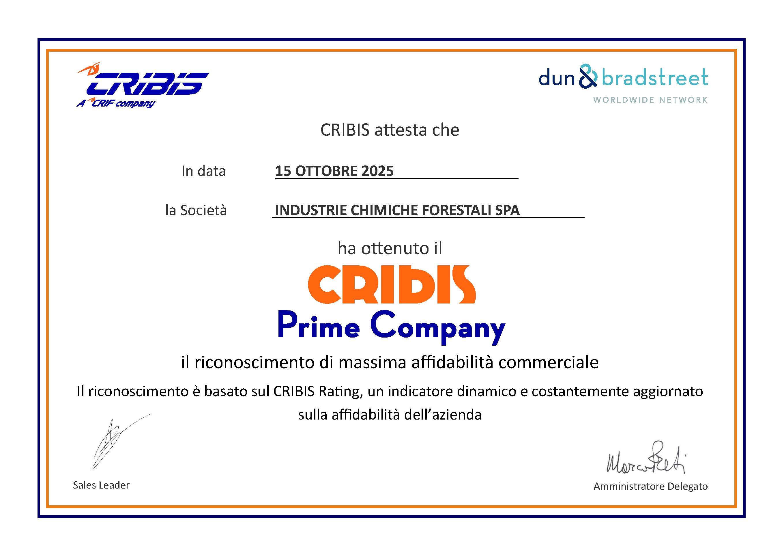 CRIBIS, società specializzata nella fornitura di business information su imprese italiane ed estere, ha assegnato a Industrie Chimiche Forestali S.p.A. il riconoscimento CRIBIS Prime Company, attribuendole il massimo livello di affidabilità come controparte di una transazione commerciale BtoB.