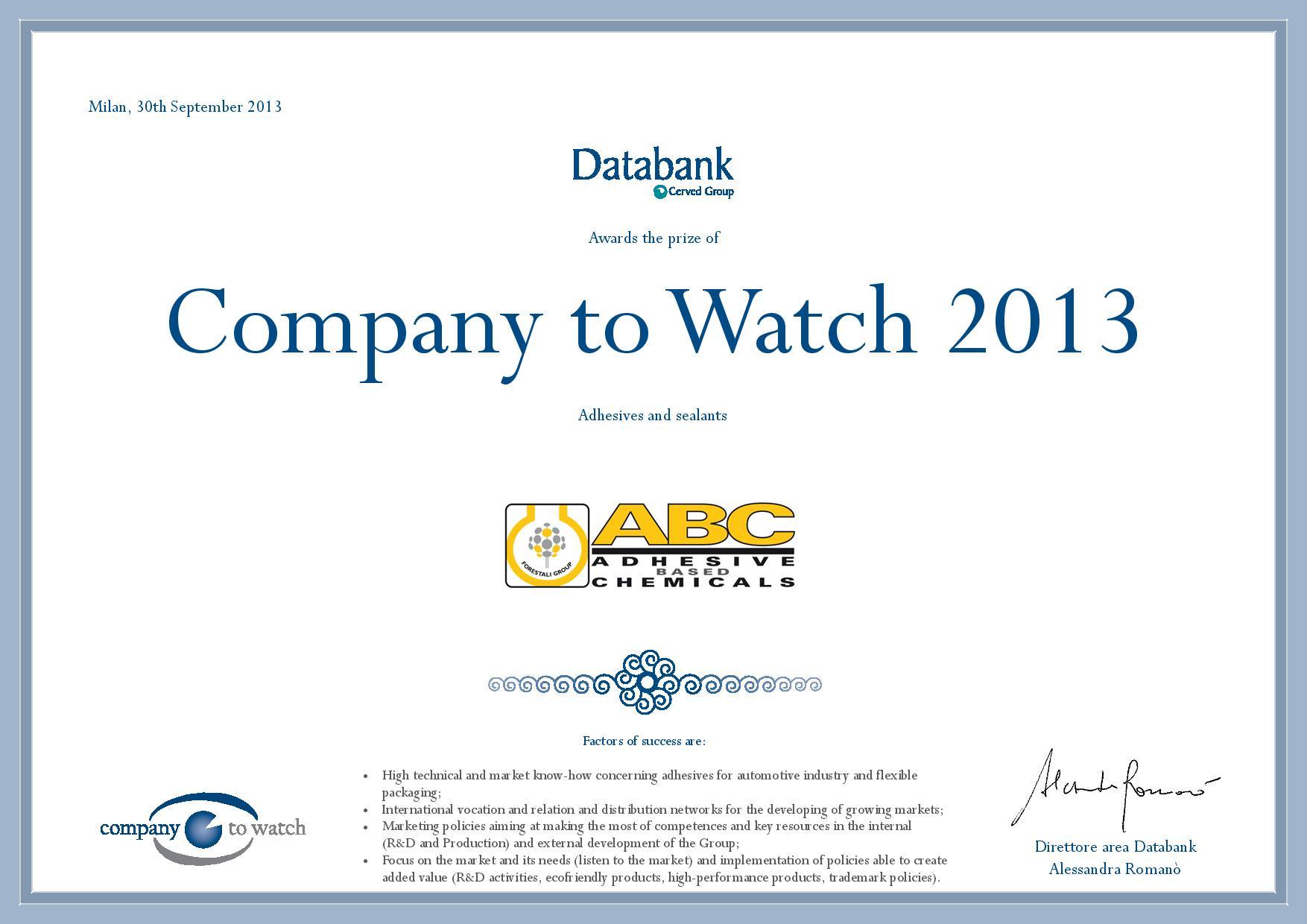 Nel mese di ottobre 2013 Adhesive Based Chemicals, società del Gruppo Forestali, ha ottenuto il riconoscimento “Company to watch” rilasciato da Databank Cerved Group.
